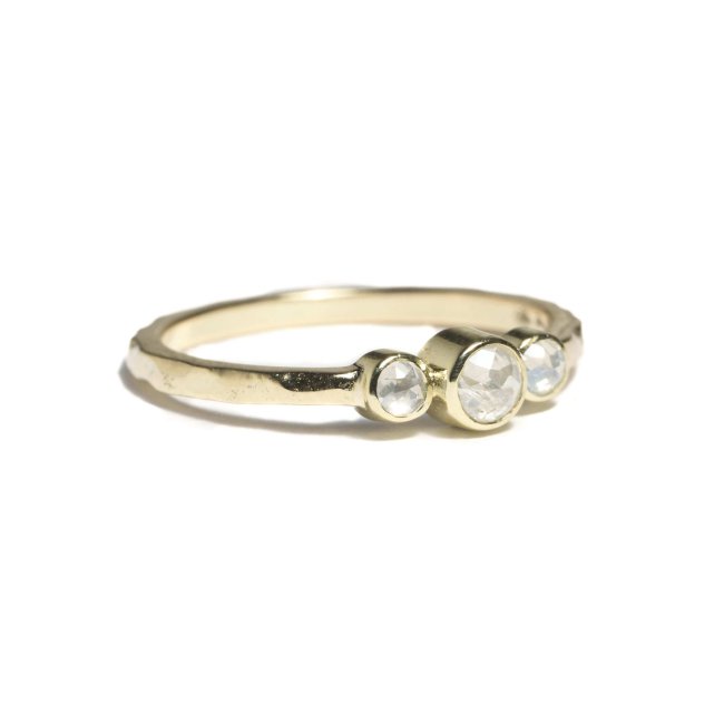 Petit Cherie met drie witte roosdiamanten Petit Cherie met een gesmolten bandje en 3 witte rosecut geslepen diamanten in strakke kastjes. Prijs: € 1325,-