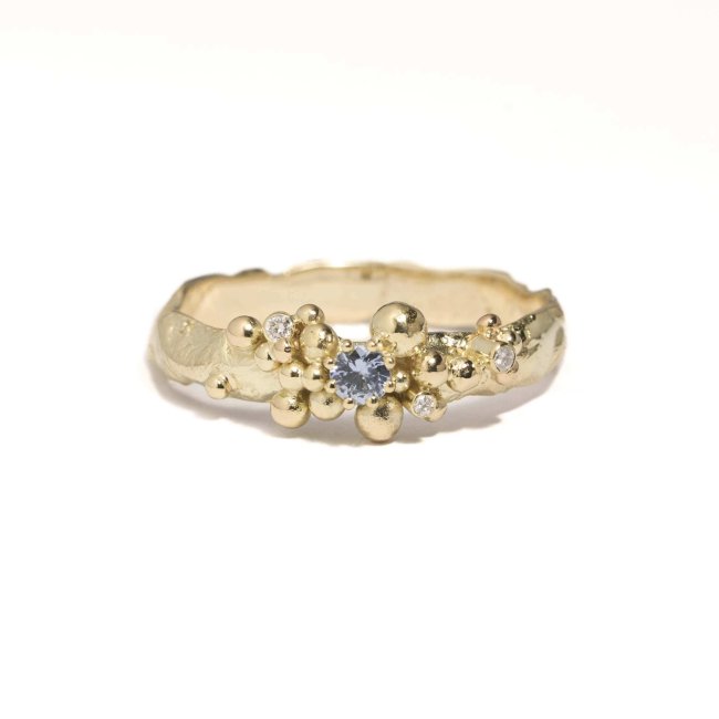 Gesmolten ring met saffier, diamanten en besprenkeld met gouden balletjes 14krt robuuste ring met gesmolten bewerking, een lila saffier van ca 3mm en 3 diamantjes van 0,005ct een 0,01ct en een 0,015ct (Vsi) gezellig besprenkeld met gouden balletjes. Verkocht