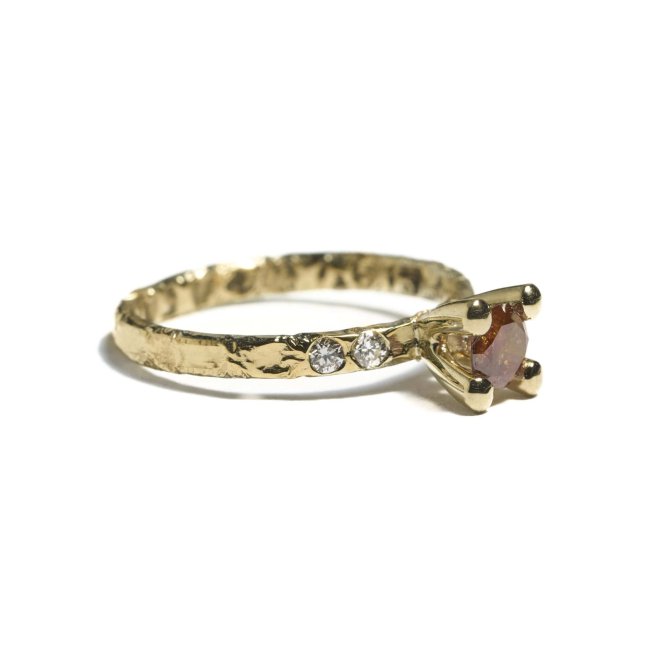 Ring met gesmolten bewerking en diamanten Wowie deze ring is mooi hoog gezet met een 0,36ct color ice diamond en in de band van de ring zitten 2 x 0,03ct witte diamantje gezellig samen. De ring heeft een gesmolten bewerking en door de color ice diamond, waarbij elke diamant uniek is door de kleur, is…