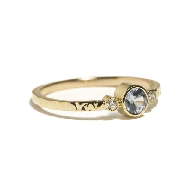 Petit Cherie met saffier en diamant 14krt gouden ring met daartussen een licht blauwe saffier van 3,5mm en wordt gezelschap gehouden door 2 diamantjes van 0,015ct per stukl. Alles bij elkaar een klassieke uitstraling in een modern jasje. Verkocht