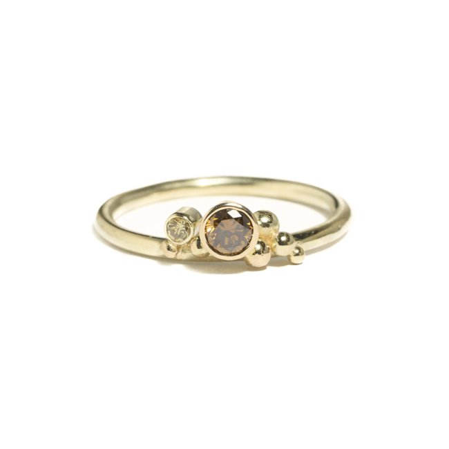 Geelgouden ring met diamanten en besprenkeld met gouden balletjes Deze 14krt gouden ring gemaakt van rond draad is gezet met een met 0.20ct ice diamond een 0.03ct olijf diamant en om het af te maken besprenkeld met gouden balletjes. One of a kind. Prijs: € 1965,-