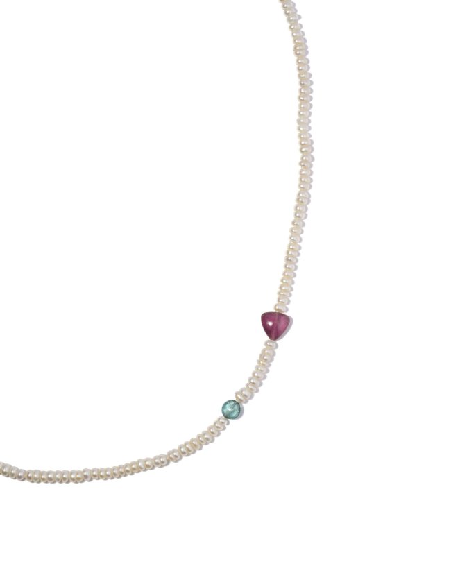Kleurrijk op draad – parels en edelstenen Parelcollier met witte parels van 3mm met twee gekleurde edelstenen knus aan elkaar geregen en voorzien van een 14krt geelgouden bolslotje. Prijs: € 535,-