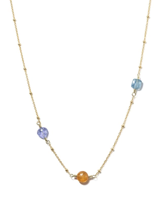 Kleurrijk op draad – Aquamarijn, tanzaniet en mandarijngranaat Leuke snoepjesketting in 14krt geelgoud en 3 verschillende edelstenen afgedraaid op geelgoud draad. Verkocht